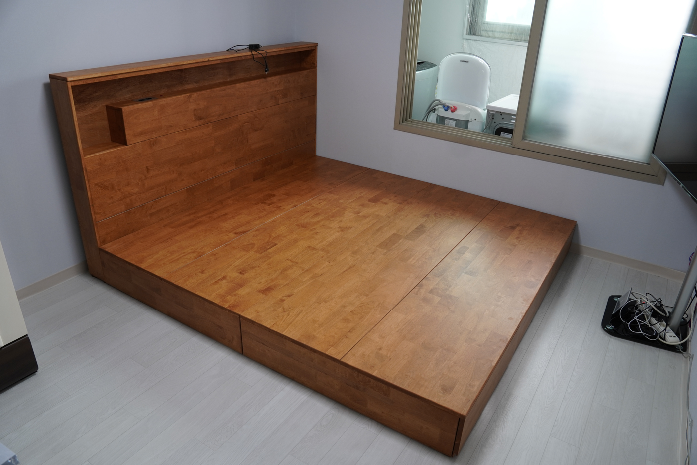 그런데 문제는 지미도 취향이 너무 자주 바뀌더군요. 바닥이 뚫려있는 프레임에서 부터 전체 서랍장 프레임, 저상형 프레임에 원목 프레임까지 다양하게 고민해본 결과 결론적으로 선택한 프레임은 홈앤힐의 저상형 원목 라지 킹 사이즈 서랍장 프레임입니다.