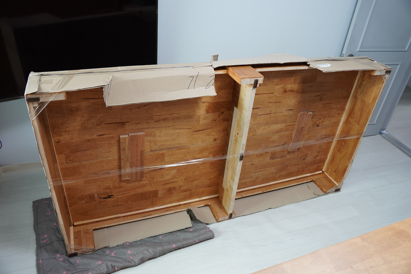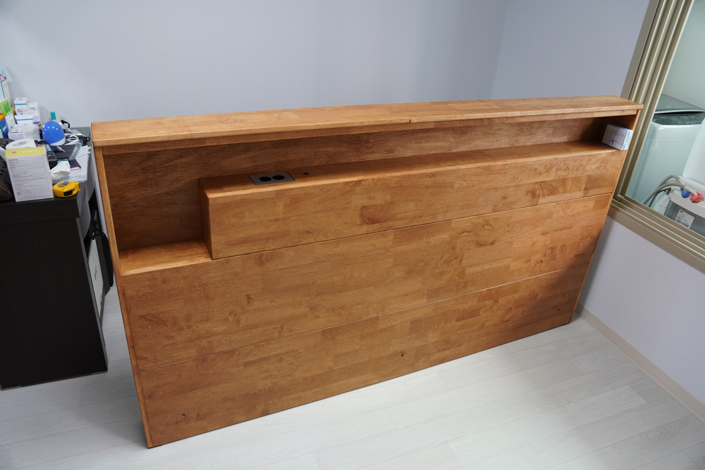 해드 다음은 중간 프레임이 도착했습니다. 프레임 하단을 보시면 아시겠지만 하단 마감 부분까지 전부 MDF가 없는 전체 원목마감 입니다. 보통 60만 원 이하의 제품은 안 보이는 하단 마감은 MDF를 사용하는 경우가 많으니 구매하실 때 반드시 확인해보시는 게 좋습니다. 해드와 중간 프레임은 나사로 연결해 고정해 줍니다.