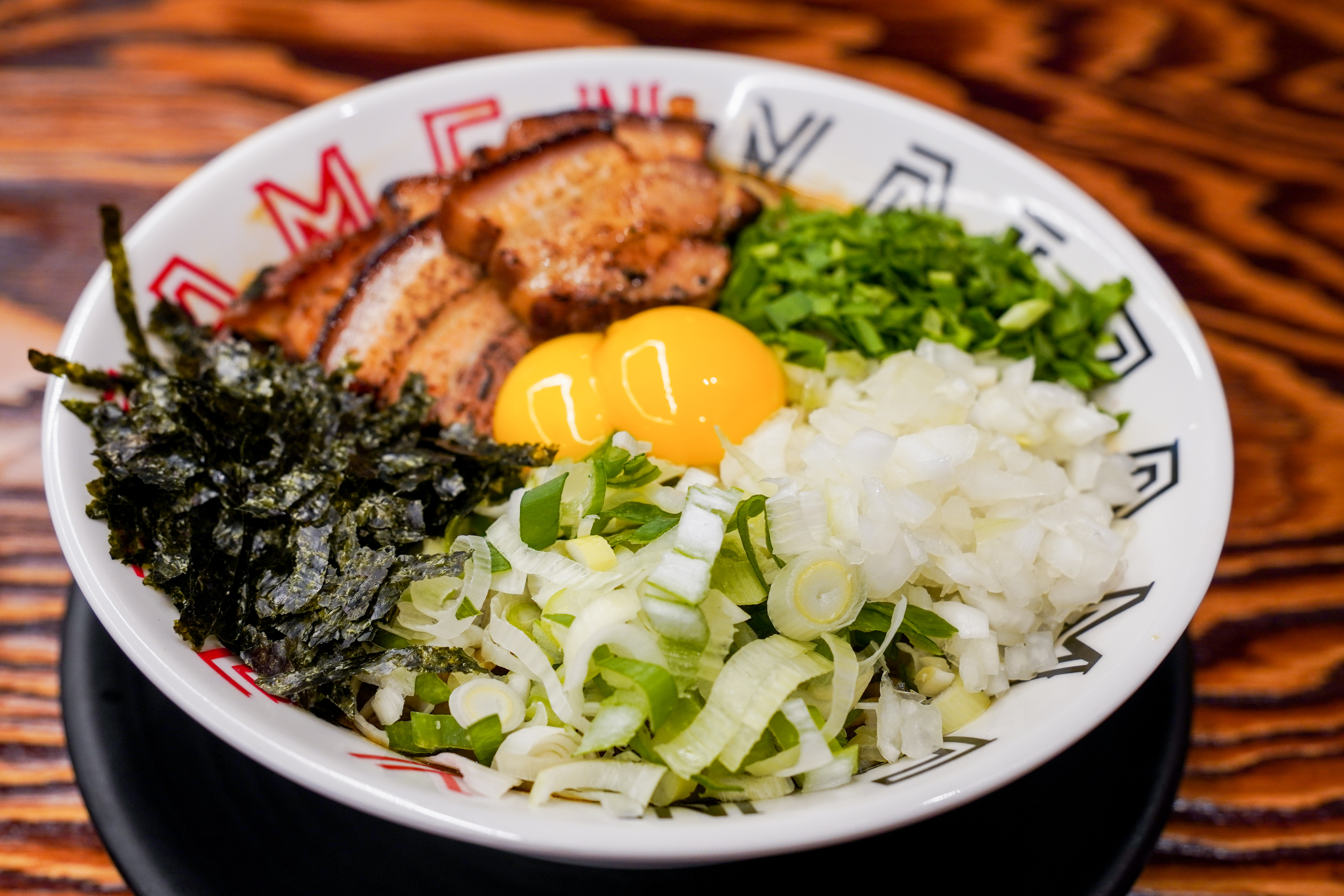 그릇에 비해 양이 많으니 넘치지 않게 조심해서 잘 비벼줍니다. 마제소바의 면은 사진에서 보시는 것처럼 일반 국물있는 라멘보다 좀 더 두껍습니다. 오늘 처음 먹어본 마제소바의 맛은 계란 간장 비빔라멘 같습니다. 맛 자체가 자극적이지 않은데도 은근히 손이 갑니다.