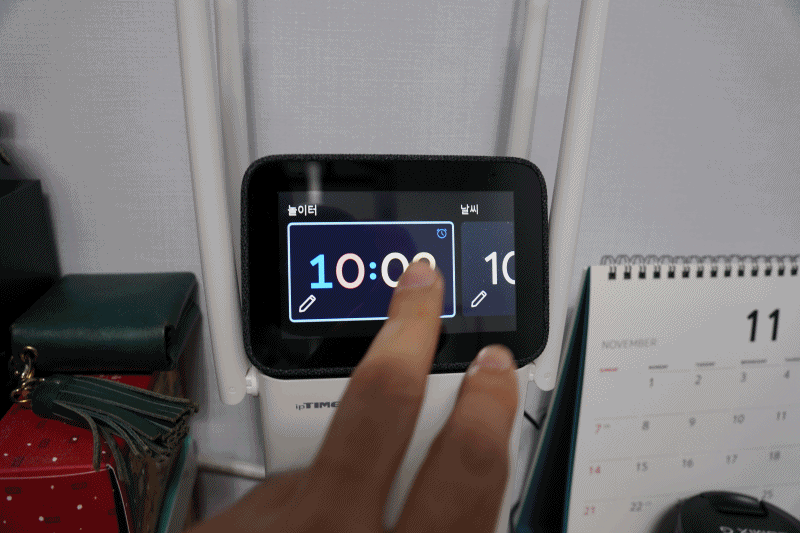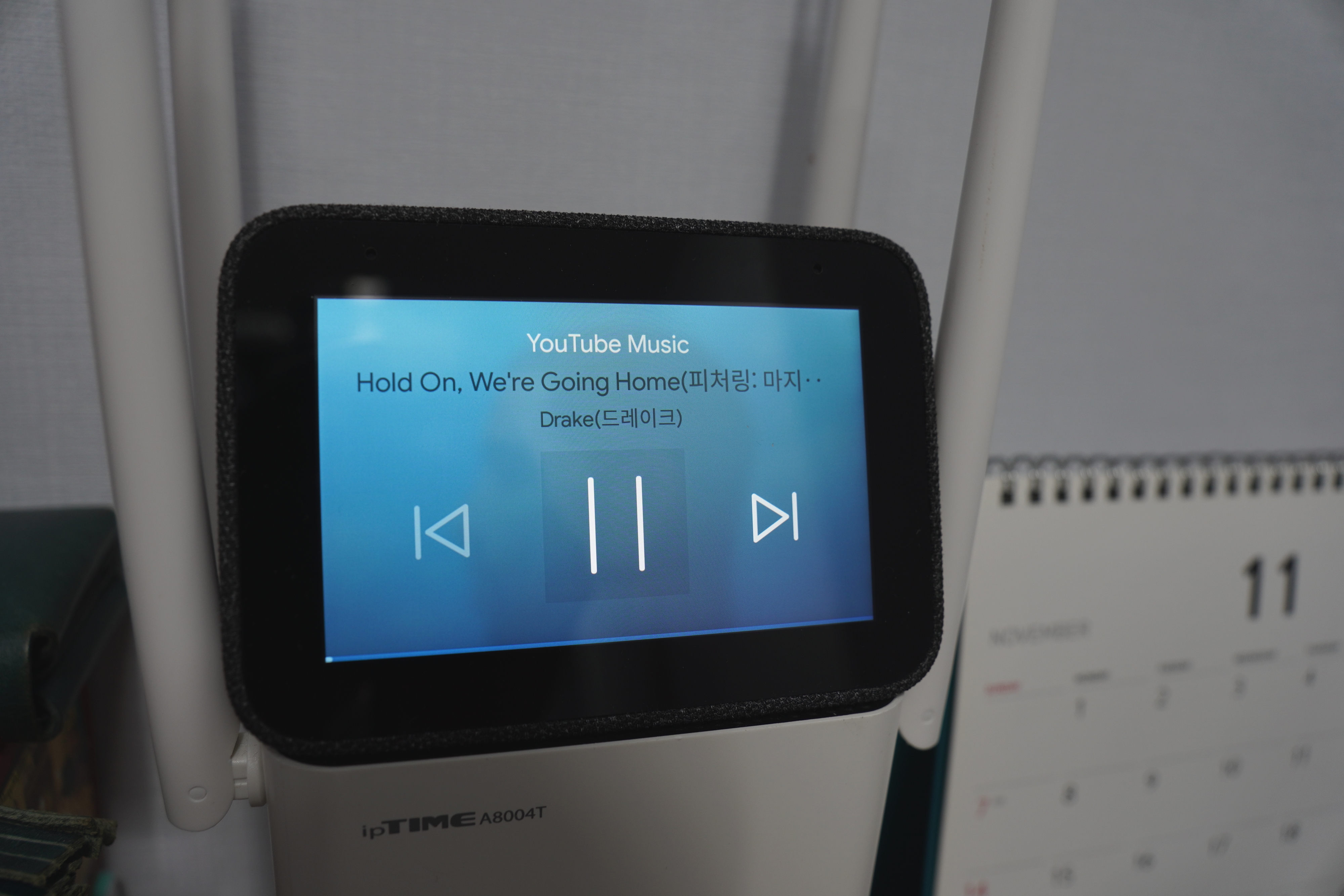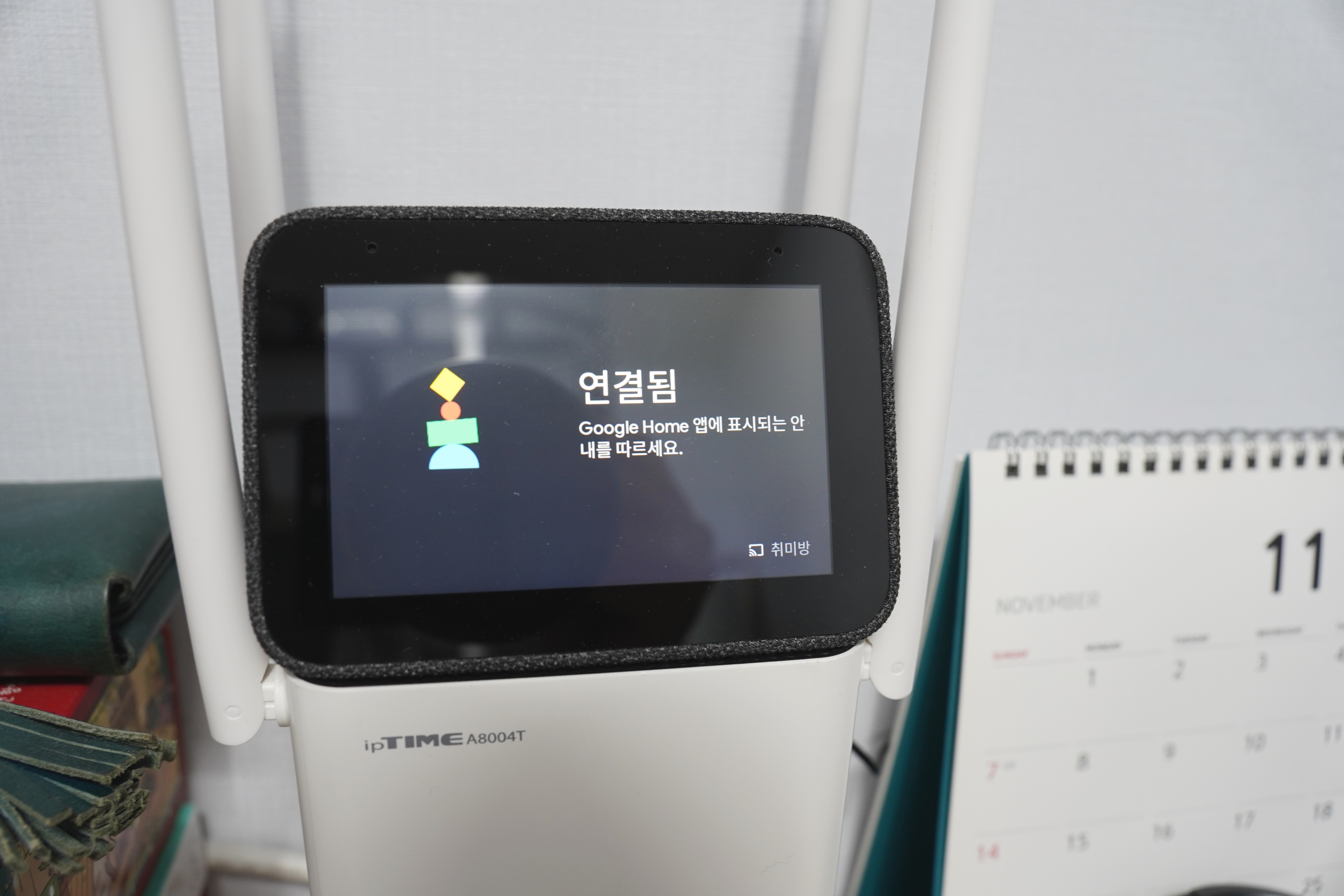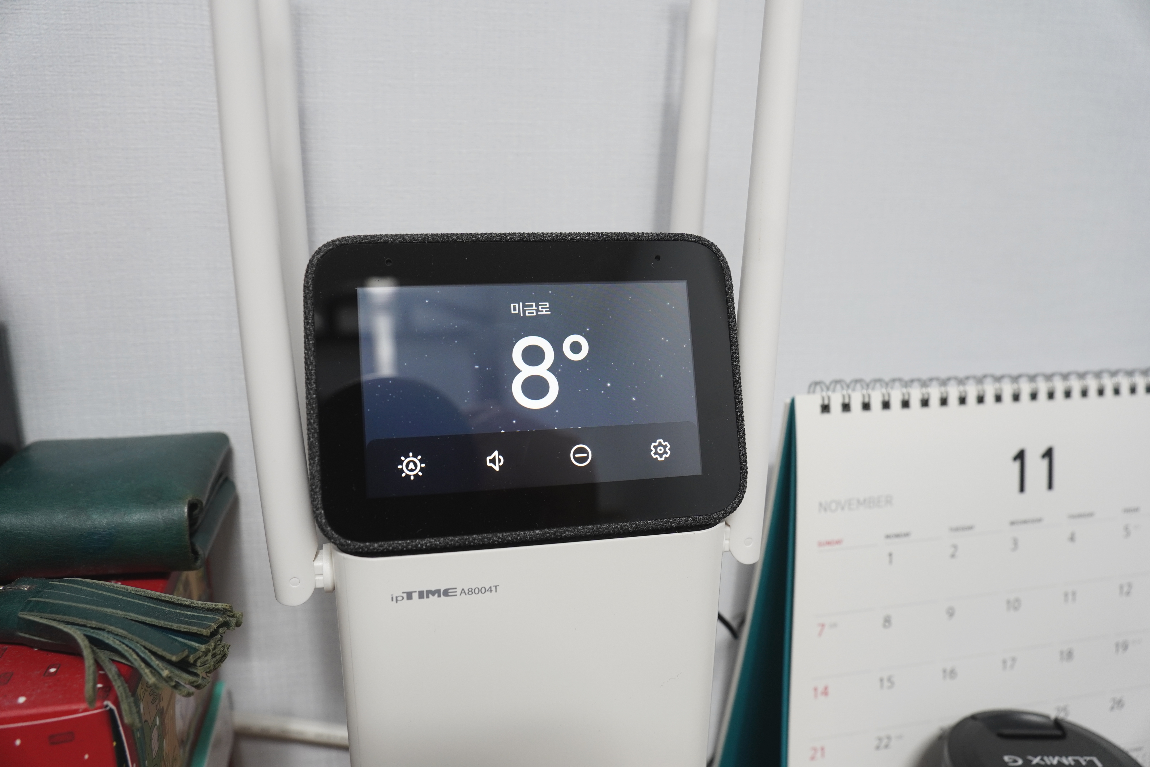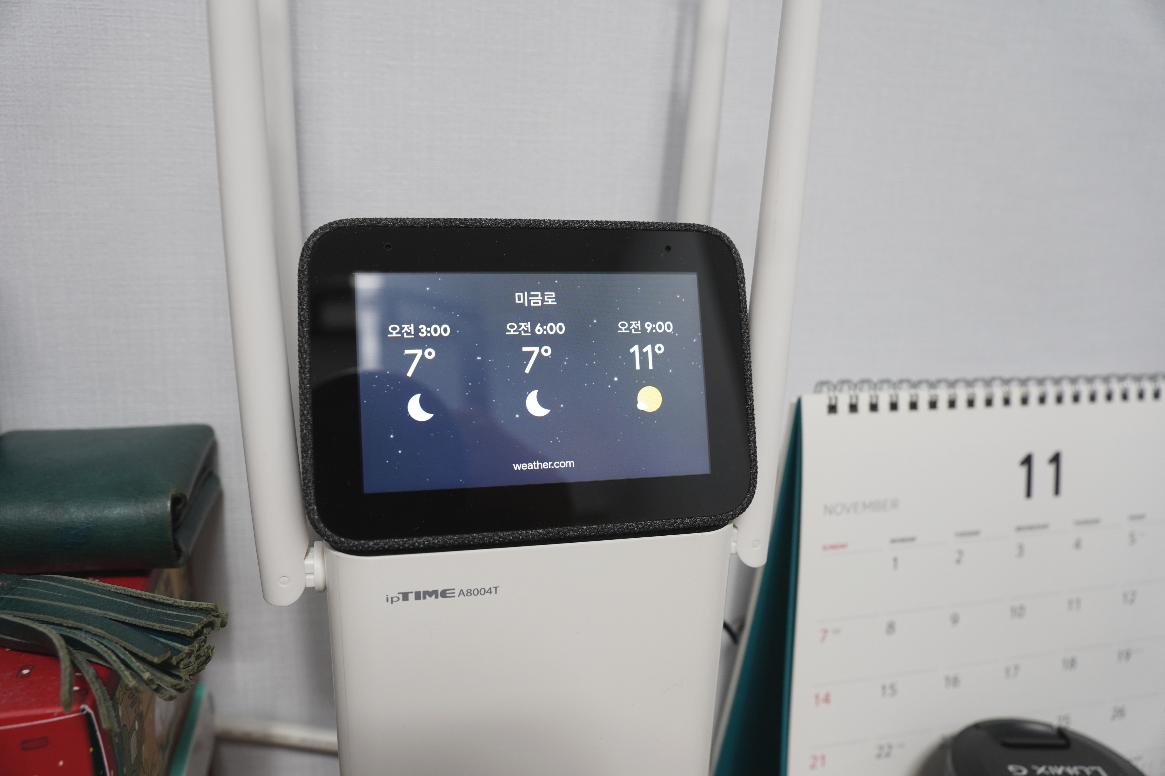 최종적으로 와이파이 설정까지 끝내면 쉽게 연결이 되고 기본 시계 화면이 나옵니다. 제품 사이즈가 작다 보니 IPTIME의 A8004T 공유기 위에 올려뒀더니 딱이었습니다.