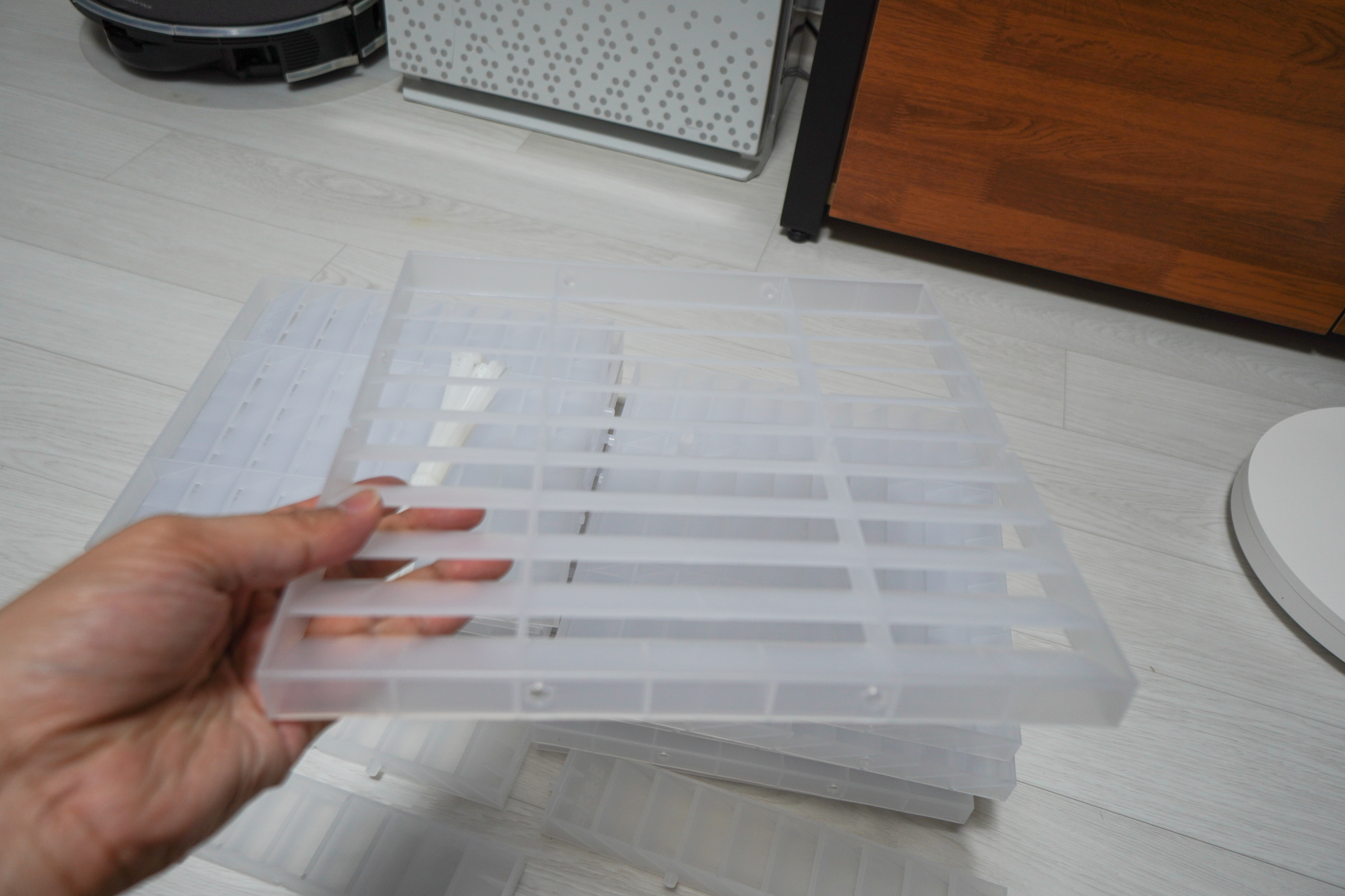 기본사이즈 25x25cm 입니다. 하나 가격은 2100원 입니다. 아이보리와 그레이 색상도 있는데 반투명이 가장 덜 답답해보일거라 판단해서 반투명색상으로 선택했습니다.