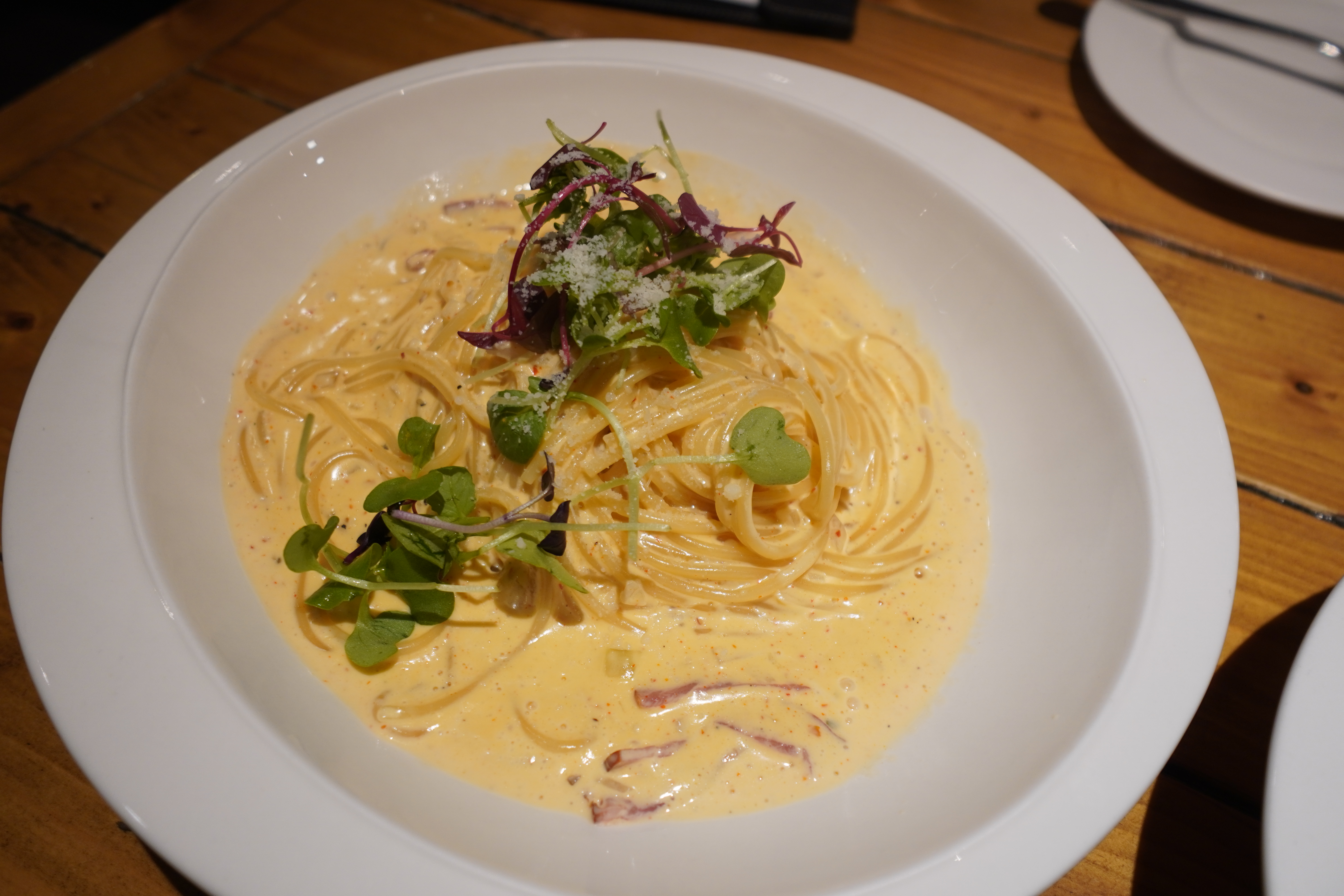 두 번째 메뉴는 핫 까르보나라입니다. 느끼할 수 있는 까르보나라를 매콤하게 만들어서 정말 맛있습니다. 개인적으로 메이빌 오면 항상 시켜먹는 메뉴 중 하나입니다. 볼 카츠를 먹고 와서 메뉴를 2가지만 시켰었는데 그래도 양이 꽤 많았습니다.