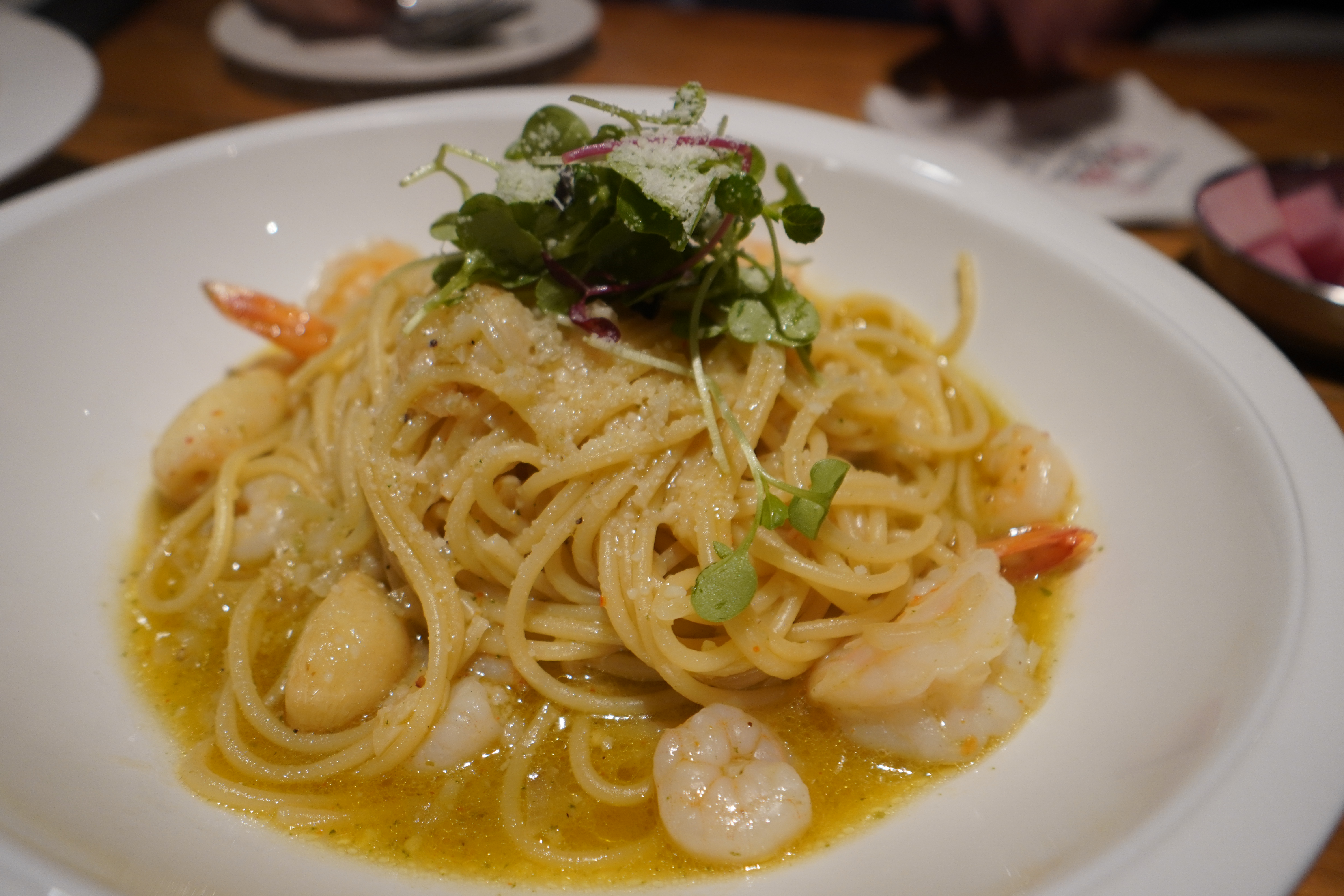 처음 나온 메뉴는 새우 알리오 올리오입니다. 나름 중형 새우가 3마리 들어가고 작은 새우도 꽤 들어가 있습니다. 깔끔하니 맛있습니다.
